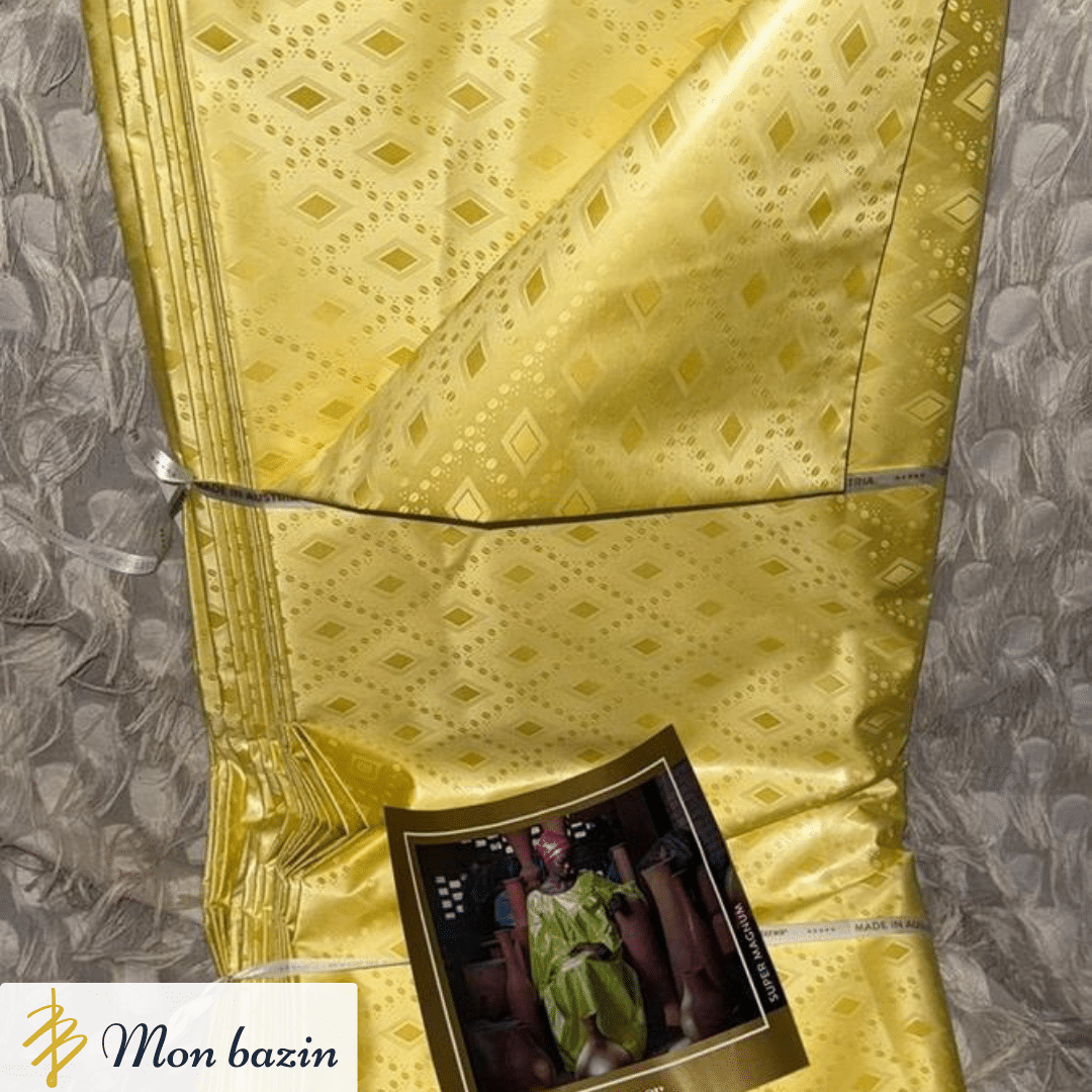 Rayonnant et raffiné, le Bazin Getzner Jaune Doré “Kita” séduit par son éclat et sa richesse visuelle. Sa teinte dorée, synonyme de prospérité et de fête, sublime chaque création et attire tous les regards.