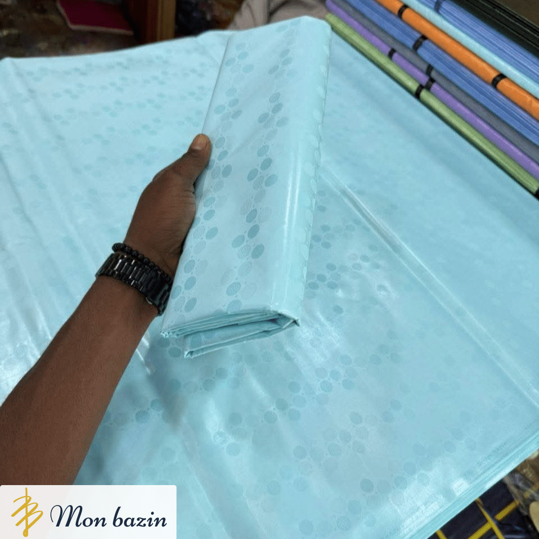 Frais et lumineux, le Bazin riche Bleu Glacier “Goundam” séduit par sa teinte claire et apaisante. Inspiré par les reflets cristallins des eaux de Goundam, ce bleu évoque la sérénité, la pureté et l’élégance intemporelle.