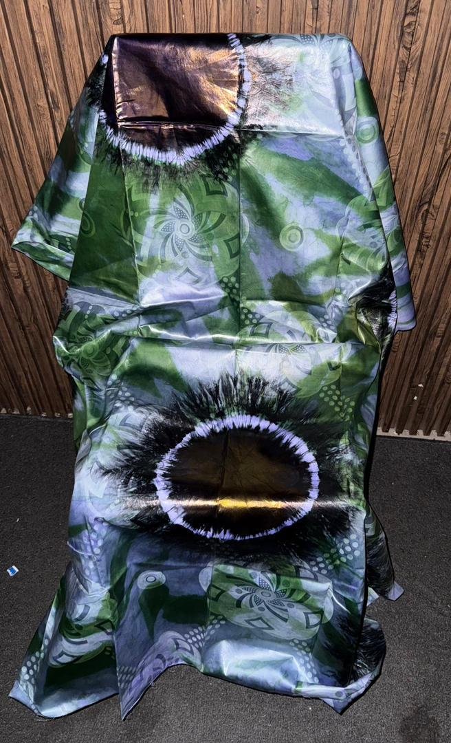 Le Bazin Teinté Vert Éclipse “Mystère du Ciel” est une œuvre textile rare et majestueuse. Ses nuances de vert profond symbolisent la fertilité et l’abondance, tandis que ses reflets argentés évoquent la pureté et la sagesse.