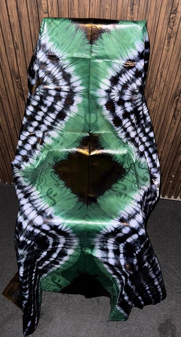 Le Bazin Teinté Vert Émeraude “Papillon” est un tissu vibrant qui évoque la liberté et l’harmonie. Son fond vert intense est magnifié par des dégradés noirs et blancs en motifs concentriques, rappelant des ailes en mouvement.