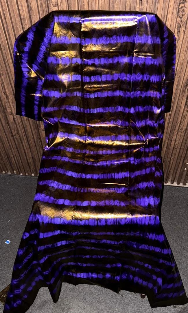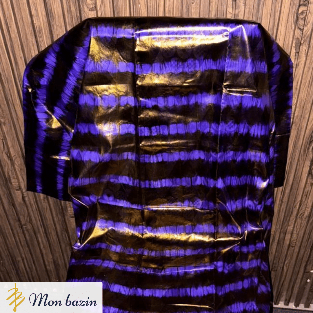 Le Bazin Teinté Violet Ébène “Bamako” impressionne par son jeu de contrastes saisissants : des rayures violettes et noires profondes qui s’entrelacent avec des reflets dorés.