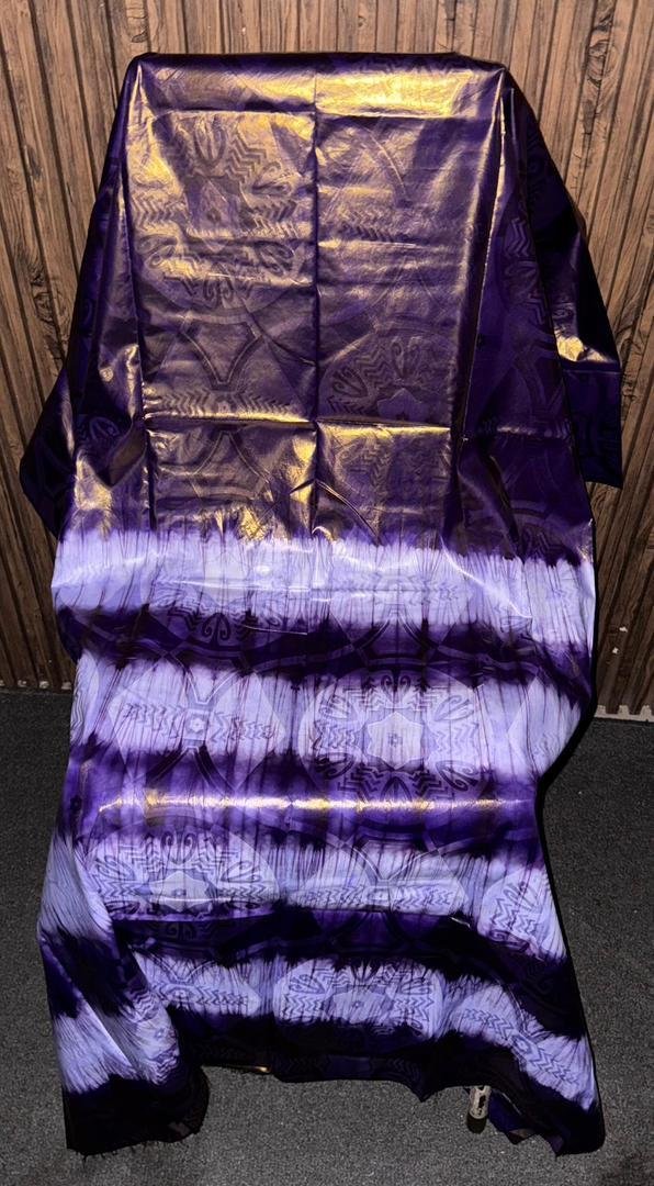 Le Bazin Teinté Violet Royal “Sikasso” séduit par son dégradé somptueux allant du violet profond au lilas clair, sublimé par des motifs damassés aux reflets dorés.